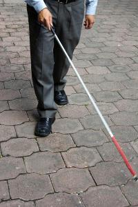As the group rises from the bench to board, you notice the man who’s ignored you reach for a white stick tucked down by his leg, while the person next to him reaches for an elbow to help him up.