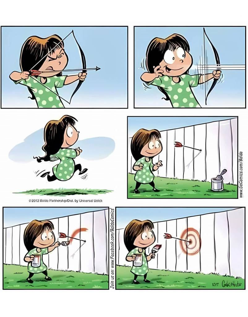 TOO MANY NEWBIE writers approach the craft like the little girl with her bow and arrow in the accompanying cartoon. It’s a version of, “Fire, ready, aim!” Backwards.